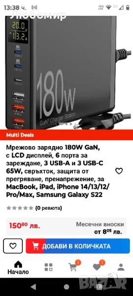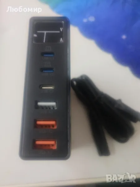 Мрежово зарядно 180W GaN, с LCD дисплей, 6 порта за зареждане, → Обява 49344081