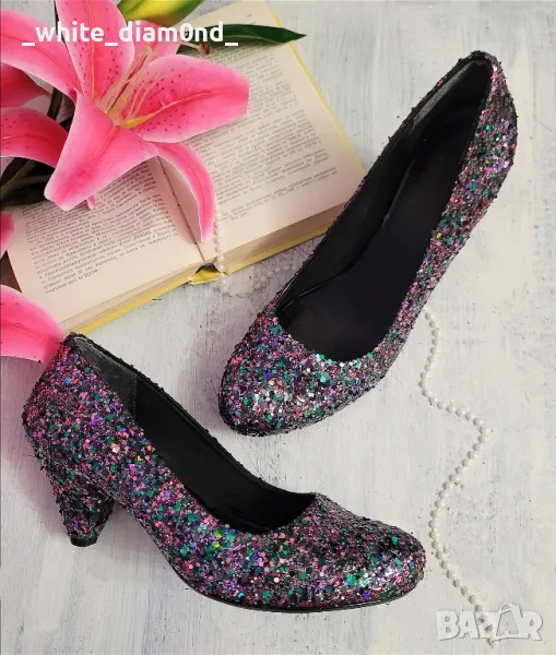 Бутикови дамски обувки лилаво/зелени на ток номер 39,5 → Обява 49344177