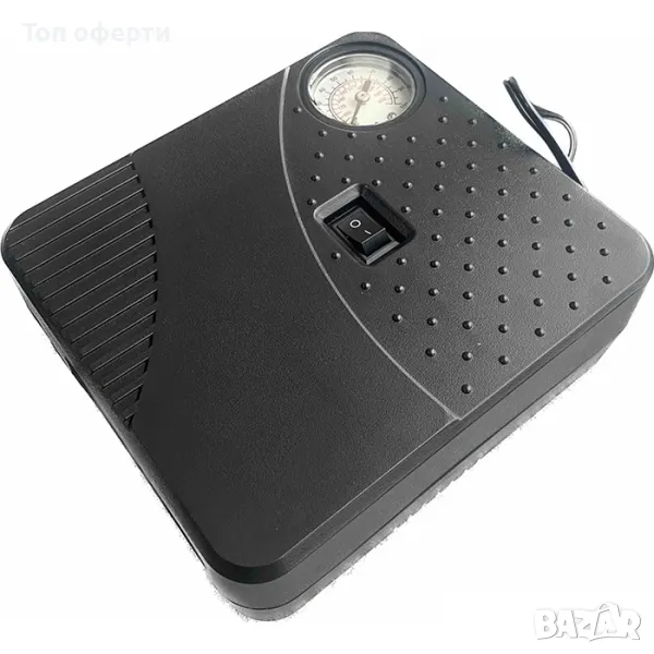 Компресорът е снабден с манометър и накрайник за връзка с гнездото за запалката на автомобила.