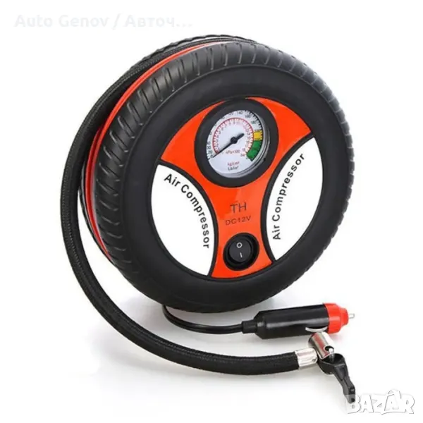 Компресор с манометър за помпане на микробуси, ATV, камиони, автомобилни и велосипедни гуми, въздушни матраци и надуваеми принадлежности.