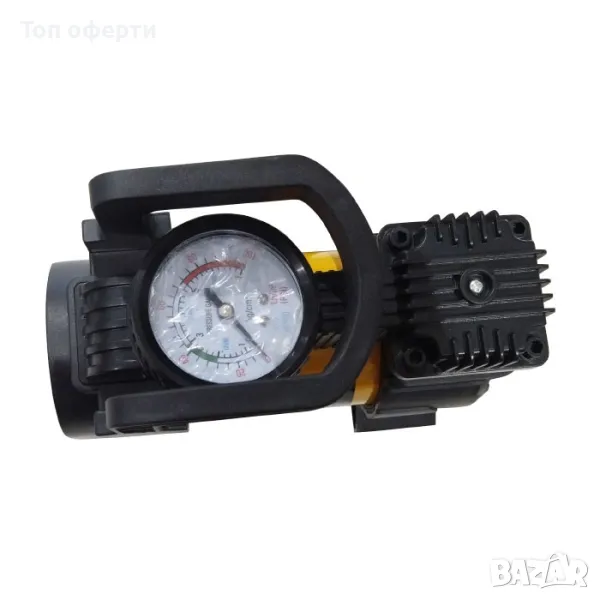 Kомпресор с манометър за помпене на автомобилни и велосипедни гуми, въздушни матраци и надуваеми принадлежности.