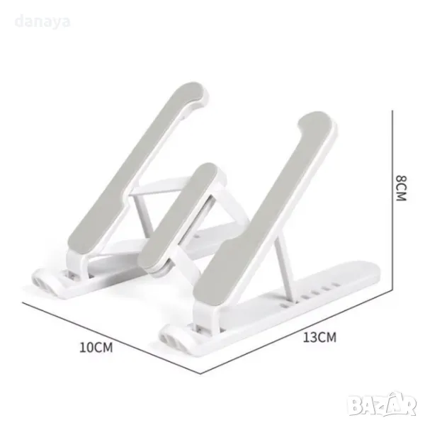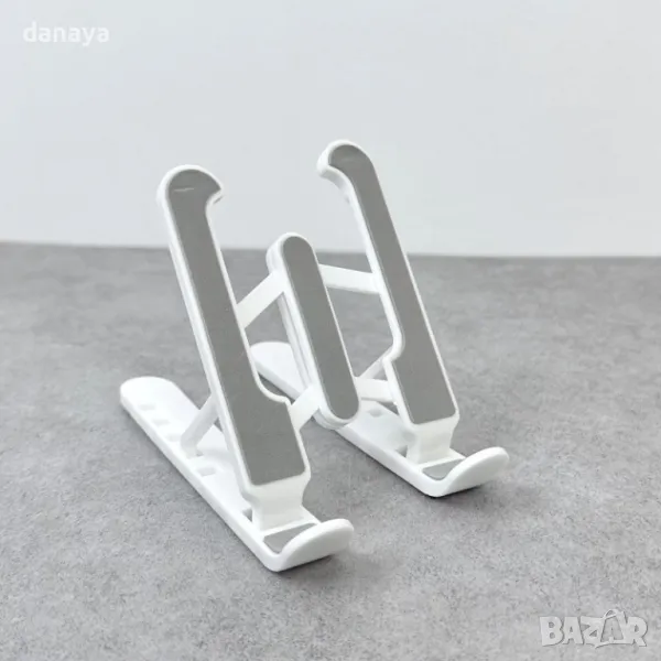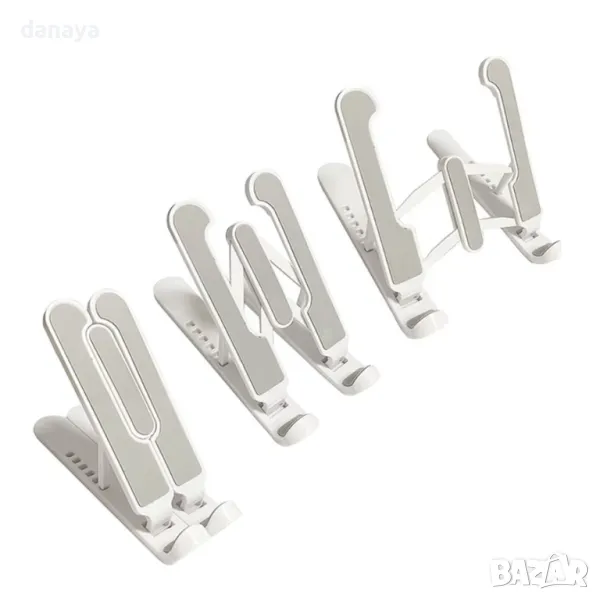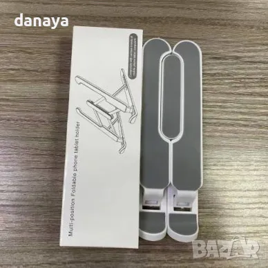 Универсална сгъваема стойка за таблет и телефон за бюро или маса с регулируем ъгъл на наклона и регулируема ширина. Универсална поставка за мобилни телефони съвместима с всички смартфони и таблети. Гумена подложка за предпазване на устройството от надраскване. Гумени крачета, осигуряващи стабилност на стойката.