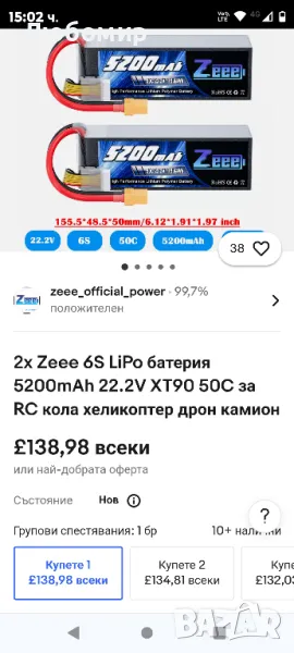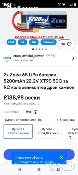 Спецификации: Марка: Zeee Напрежение: 22,2 V Капацитет: 5200 mAh Скорост на разреждане (C): 50C Конфигурация: 6S1P Тип конектор: XT90 Тип конектор за балансиращ щепсел: JST-XH Дължина: 155,5 мм/6,12 инча Ширина: 48,5 мм/1,9 инча Височина: 50 мм/1,97 инча Тегло на батерията (dev.10g): 742g/26,17oz/pc Съвместими RC модели: Специално проектирани за MIKADO LOGO500, ALIGN T-REX550/600, GAUI X5, Outrage 550, Hirobo SDX, големи мултиротори, EDF Jets, размер от 600 до 700 хеликоптери и т.н. (Само ако напрежението, размерите и щепселът съвпадат, тогава ще пасне