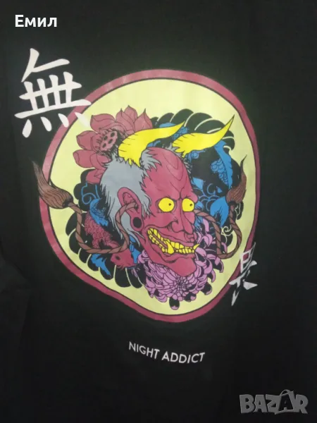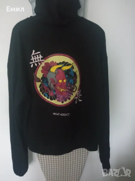 Суичър със щампа японски йероглифи отпред и японски зъл дух отзад, кройката е такава , че ръкавите са дълги а дължината на дрехата е къса , до кръста ,при интерес ще дам мерки. Бранд: Night Addict , размер XL.