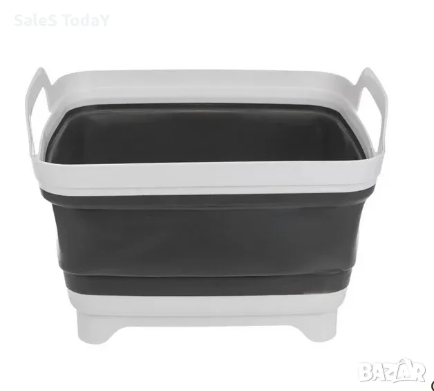 Бял сив пластмасов леген с дръжки, сгъваем. Натиснете в центъра, за да отворите и след употреба натиснете краищата, за да затворите. В долната си част има капачка на винт за лесно и бързо изпразване на съдържанието. В затворено състояние се съхранява лесно.
