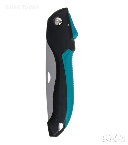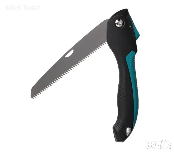 Ръчен трион в син и черен цвят с острие от въглеродна стомана 180 мм и назъбване, 1"-7 TPI. Има два ъгъла на рязане, единият е 180 градуса, а другият е 140, с нехлъзгаща се мека дръжка, изработена от PP и 15% фибри и TPR за по-удобен контрол, безопасност да не се оставя отворен и отвор за окачване.