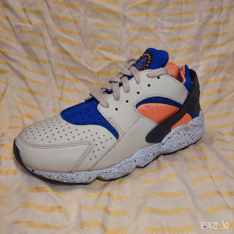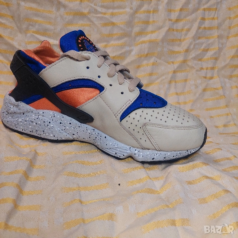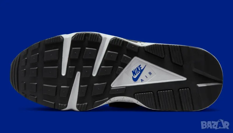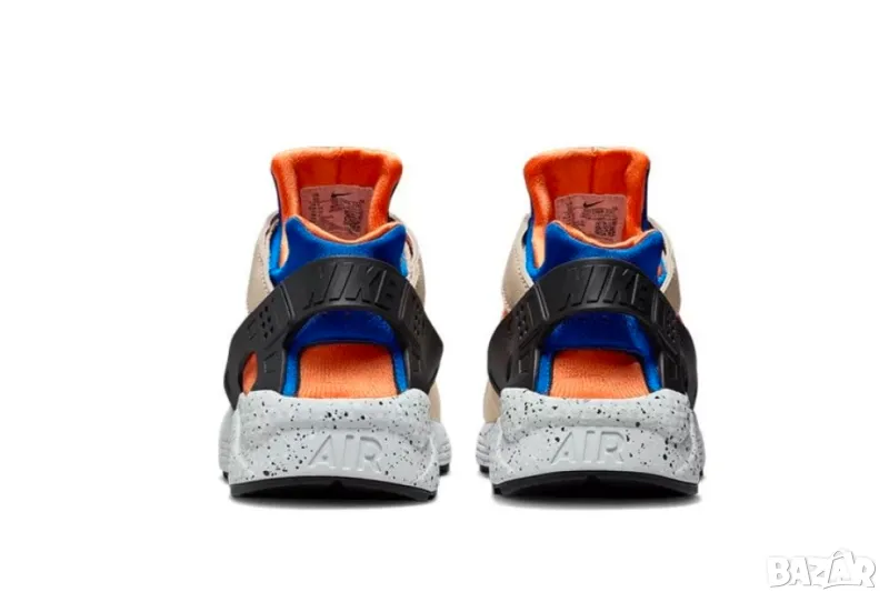 ратан, вдъхновена от цвета на OG Mowabb. Гуменото лого Huarache се вижда на езика в черно, кралско и оранжево с гумената външна клетка на петата, която се вижда в черно с марка Nike на петата. Капсулираната междинна подметка Nike Air се вижда в сиво с бели и черни петна навсякъде, а черна външна подметка завършва маратонката.