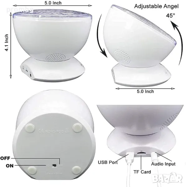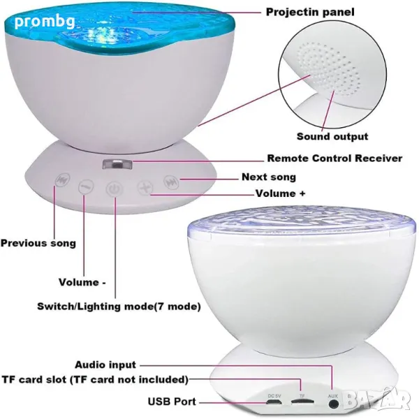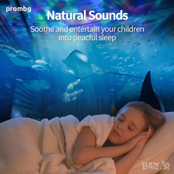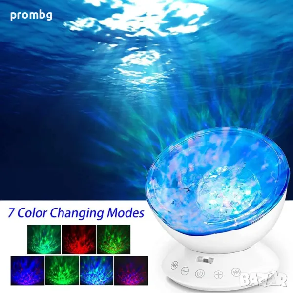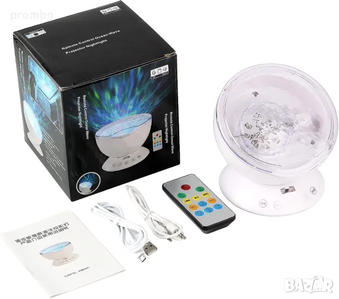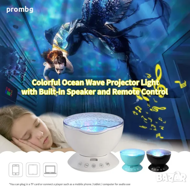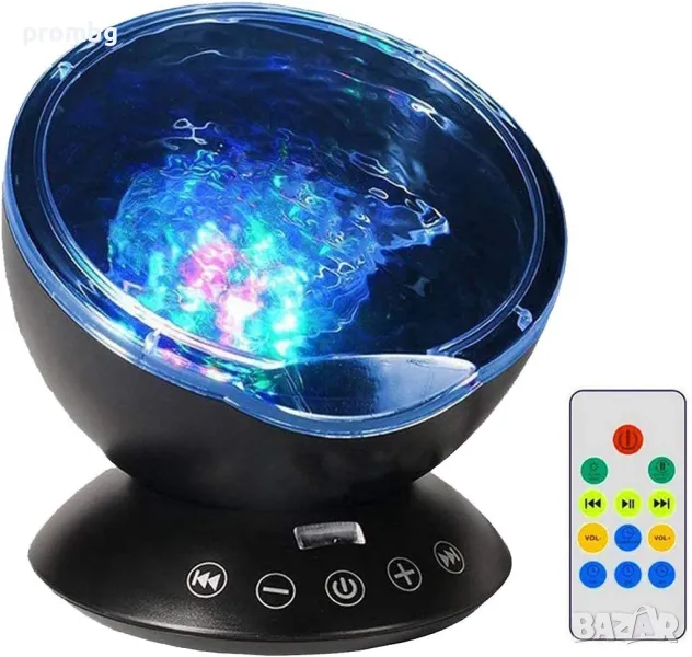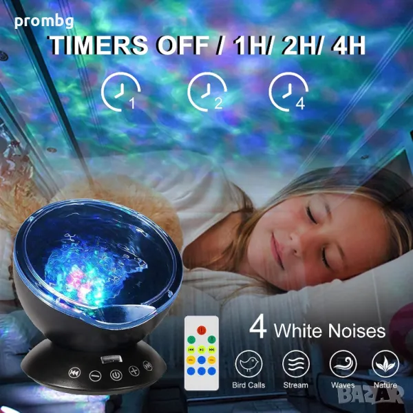 Проектор с океански вълни, нощна лампа с мелодии. Различни варианти на светлината - 7 режима и въртене на 360 градуса, 4 варианта на мелодията: морски вълни, птички в гората, течаща вода, щурче, рекичка. Създава се усещането за природа с луна, звезди, галактика, небе и вълни за отпускане на ума и тялото. Вграден високоговорител и дистанционно управление: Можете да включите и свържете вашия телефон или компютър към този проектор като използвате 3,5 mm аудио кабел. Можете да използвате дистанционното управление, за да го включвате/изключвате; смяна на режимите; възпроизвеждане/пауза/пропускане на музика; контролирайте силата на звука и задавайте таймери. Настройте светлините на проектора да се изключват след 1 час, 2 часа или 4 часа. Лампата е налична в черен цвят.