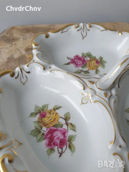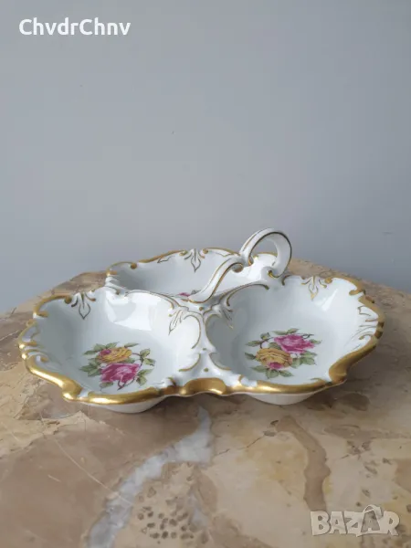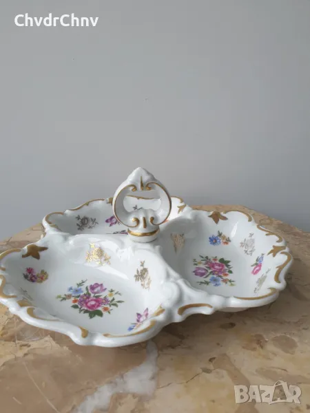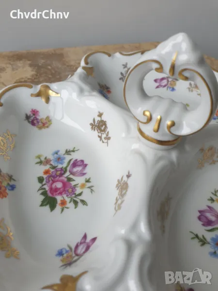 Диаметър 19 см, плътен/тежък порцелан, флорална декорация (цветя във всяка секция) и 22К злато, перфектно състояние (никакви забележки, без протривания по позлатата), като нова.