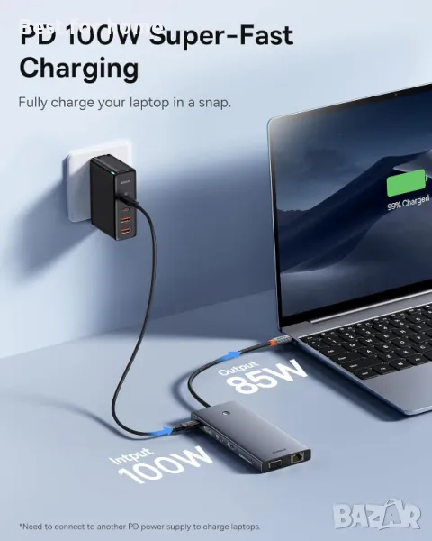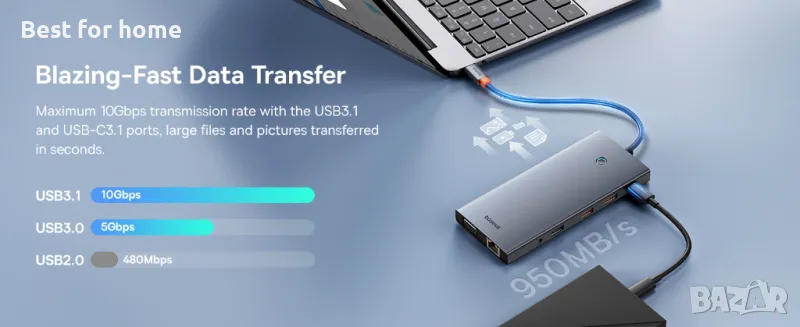Gigabit Ethernet и PD 100W мощност: Чрез Gigabit Ethernet порт можете да имате по-бързо и по-стабилно сърфиране в интернет или скорост на игри с по-малко натоварване и буфериране в сравнение с Wi-Fi връзката. А портът PD 100W поддържа бързо зареждане (до 85W изход), така че можете да захранвате устройствата си, докато имате достъп до другите функции на хъба.
