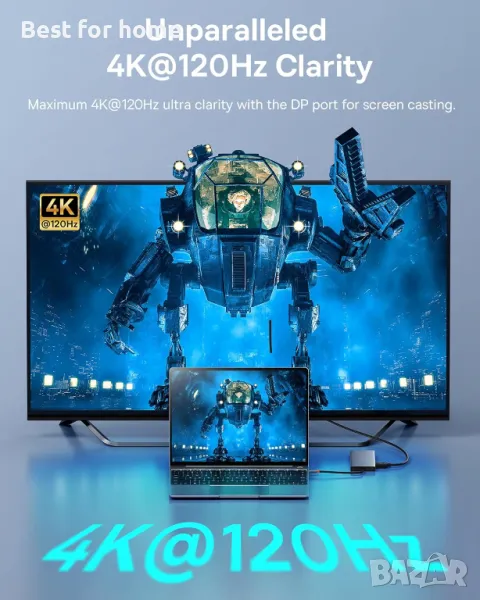 Макс. 4K@120Hz изход чрез DisplayPort1.4 с DSC: Този хъб поддържа максимум 4K@120Hz през DisplayPort 1.4 с DSC, който може да осигури превъзходна визуална яснота и ярки детайли на дисплея без забавяне или засядане. И също така е обратно съвместим с 4K@60Hz, 4K@30Hz и 1080P@60Hz.【*ЗАБЕЛЕЖКА: Компресията на потока на дисплея (DSC) се поддържа, като се започне от 11-то поколение Intel Core Processor Graphics (известен също като Tiger Lake) и по-нов.】