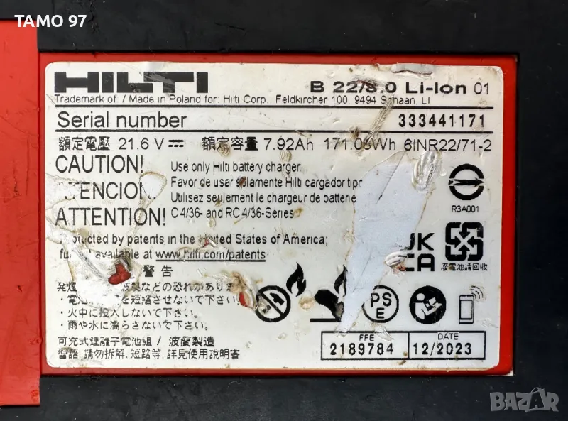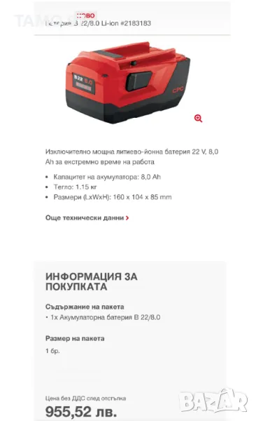 Продавам акумулаторна литиево-йонна батерия на Хилти за машини и инструменти, които работят с 22V батерии от B серията. Батерията е 22V 8.0Ah с индикатор има козметични следи от използване, но се зарежда до край без да дава грешки и държи перфектен заряд, производство от 12.2023г. внос от Франция. Пращаме с опция преглед и тест с куриерска фирма еконт може и лично предаване за гр. Шумен.