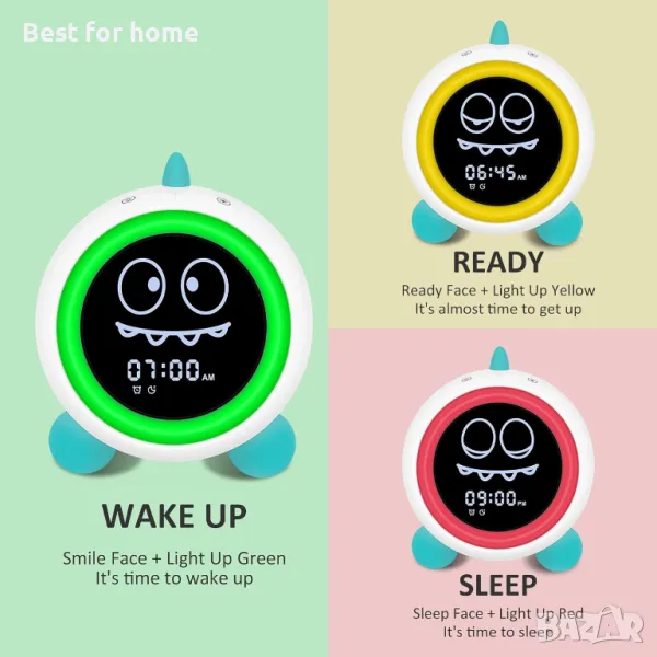 【Часовник за обучение на деца】 „Време ли е да ставам?“, нашият треньор за сън използва цветове и изражения на лицето, за да научи малкото дете да разбира концепцията кога да остане в леглото и кога да стане. Оставете „Дино“ да расте заедно с вашето дете. Това ще бъде бърз преход от редовно събуждане в 4 сутринта към сън през цялата нощ.