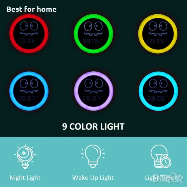 【Нощна светлина】 9 цветна светлина за избор като нощна светлина или светлина за събуждане. Бяла светлина с 5 яркости, циферблат с възможност за димиране, не се притеснявайте, че сте „твърде ярки“ през нощта. Нощната лампа може да се изключи автоматично след определен период от време или да остане включена цяла нощ.