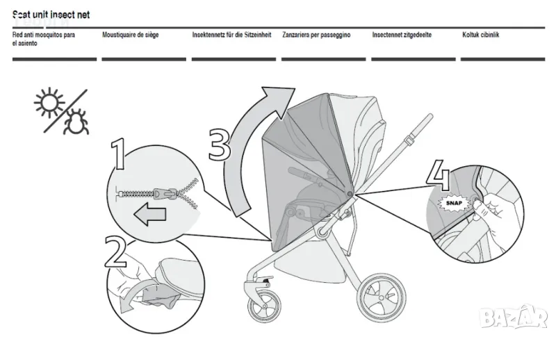 на бебе, мрежа за комари, дъждобран, поставка за чаша и др. Изключително лесна