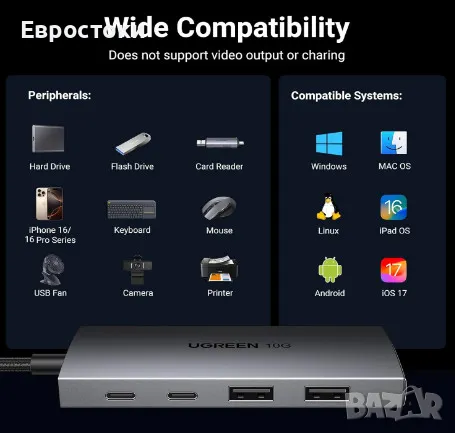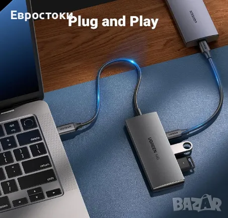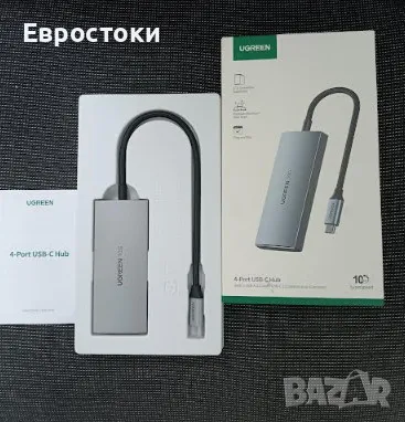 USB хъб UGREEN с 4 порта. Многопортовият USB C хъб трансформира USB-C порта на вашия лаптоп в 2 х USB-C 3.2 и 2 х USB-A 3.2 порта за данни. 4-те порта могат лесно да свързват различни USB периферни устройства и да работят едновременно, като бързо подобряват ефективността на работа. (Забележка: USB-C портовете не поддържат видео изход или зареждане).