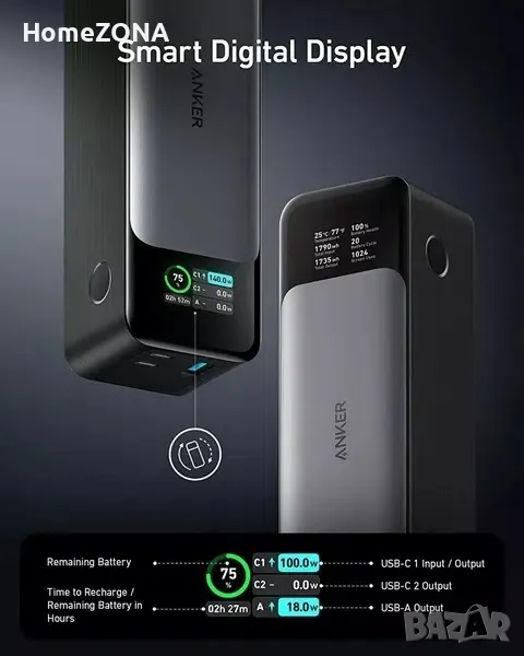 Външна батерия Anker Prime 737 GaN PowerCore, 24000 mAh, PD 3.1, сив → Обява 49354118