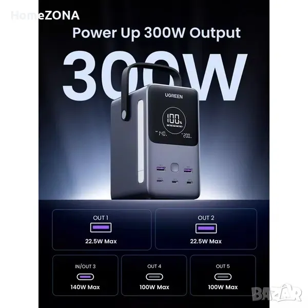 - Мощност: 300W, USB-C х 2 – 100W всяко, USB-C х 1 – 140W и USB-А х 2 – 22,5W всяко