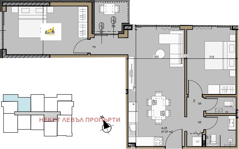 Некст Левъл Пропърти предлага на Вашето внимание тристаен апартамент със следното разпределение: Хол със кухненски бокс,две спални, тоалетна, баня с тоалетна, тераса и мокро помещение/склад.