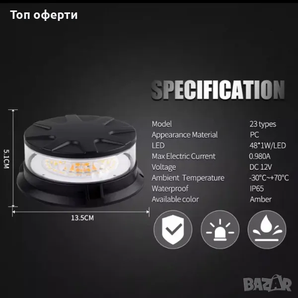 Сигнална лампа тип (маяк) работеща както на 12 така и на 24 волта. С изключително силна и ярка блиц светлина с цел безопасност. Маякът е подходящ за автомобили, бусове, камиони, трактори и за извън габаритни товари.
