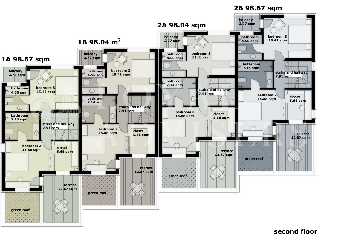 - Вторият етаж е с площ от 98.04 кв. м и се състои от: коридор със стълба; спалня със собствена баня с тоалетна и изход към балкон; втора спалня със собствена баня с тоалетна, дрешник и изход към тераса и зона с покривно озеленяване от екстензивен тип. Вторият етаж е свързан с покрива посредством стълби.
