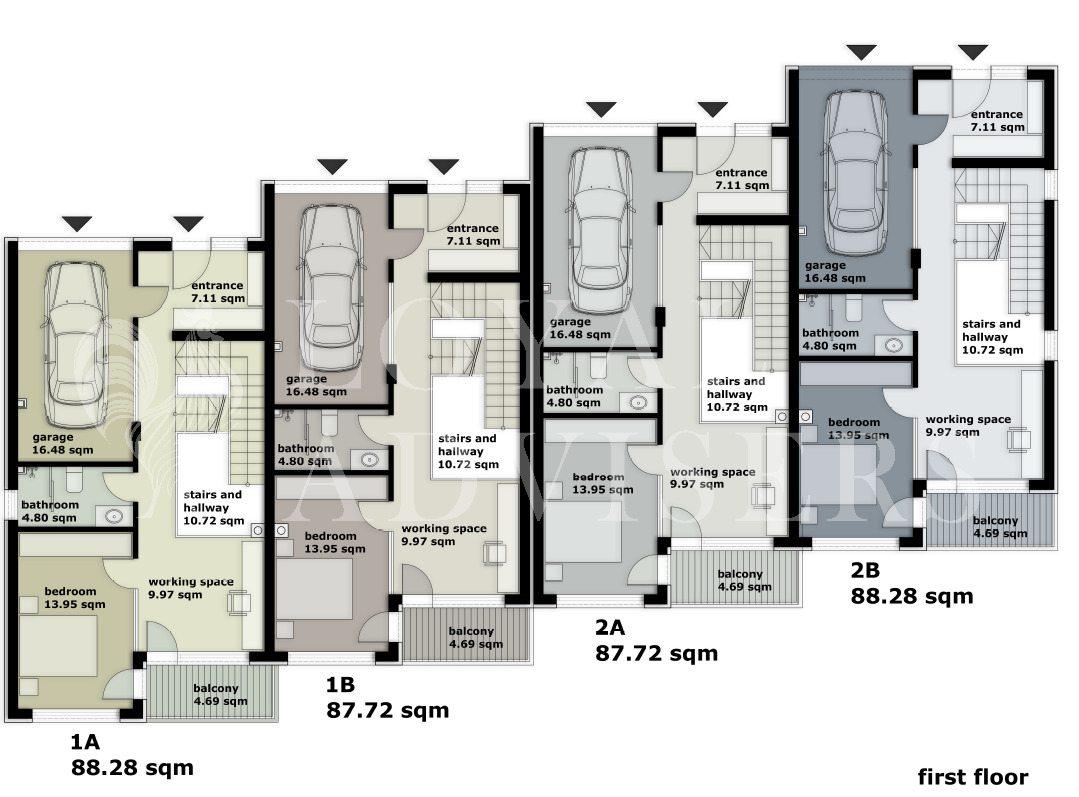 Всяка къща ще разполага със собствен двор, разположен пред първи жилищен етаж, и алея за коли, водеща към гаража.
