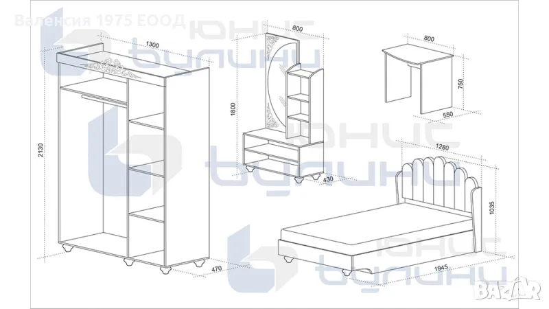 Леглото е с повдигащ амортисьорен механизъм, за матрак 120/ 190 см. Трикрил гардероб с огледало, четири рафта и лост за закачалки.