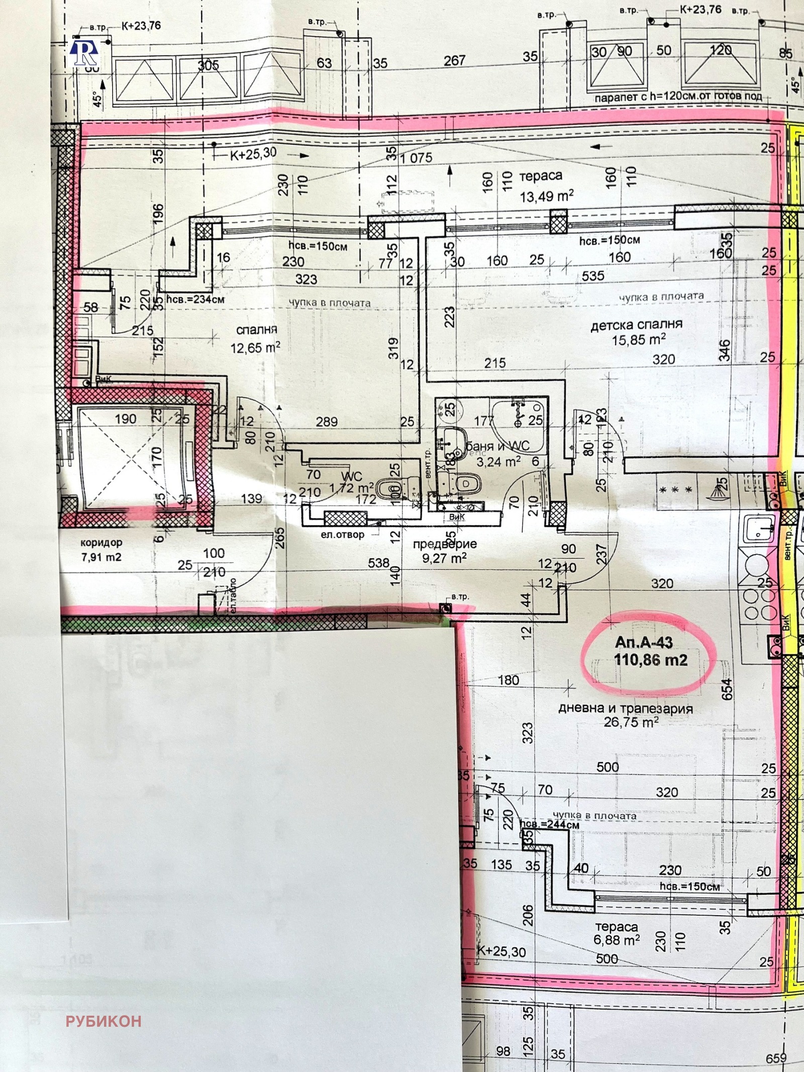 Рубикон недвижими имоти Ви предлага двустаен апартамент в нов жилищен комплекс с акт 16 със съвременна и модерна архитектура с отлична инфраструктура, пешеходни и велоалеи, паркове и широки булеварди с много добре развита транспортна мрежа. Разпределение: дневна с кухненски бокс 26.75кв.м., спалня 15.85кв.м., спалня 12.65кв.м.,баня с тоалетна 3.24кв.м., тоалетна 1.72кв.м., тераса 13.49кв.м., тераса 6.88кв.м., коридор 7.91кв.м., антре 9.27кв.м. и маза. Застроена площ 110.86кв.м. В близост до комплекса има училище, детски градини, поликлиника, търговки центрове, магазини и ресторанти. За строителство се използва червена тухла, хидро и топлоизолация, PVC дограма с 5-камерен стъклопакет, луксозно завършени вътрешни и външни парапети, входна блиндирана врата, интериорни MDF врати, електрически асансьор заложени по два асансьора на вход, луксозни общи части.