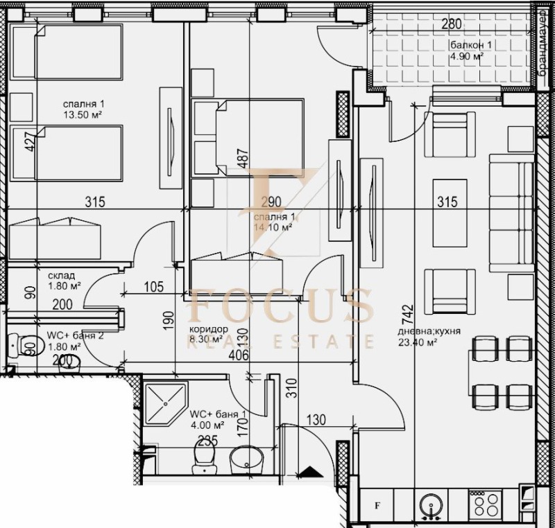 Апартаментът е с обща площ от 99,74 кв.м. със следното разпределение: коридор, хол с кухненски бокс, две спални, баня с тоалетна, отделна тоалетна, склад и тераса.