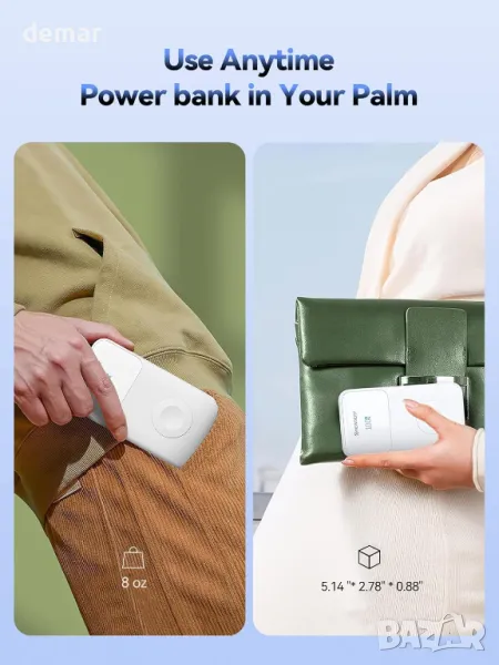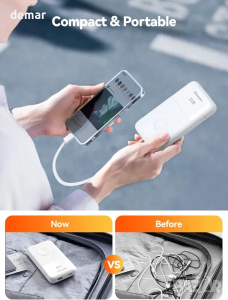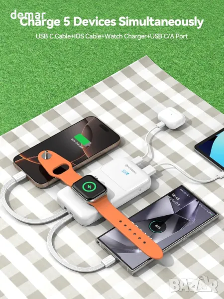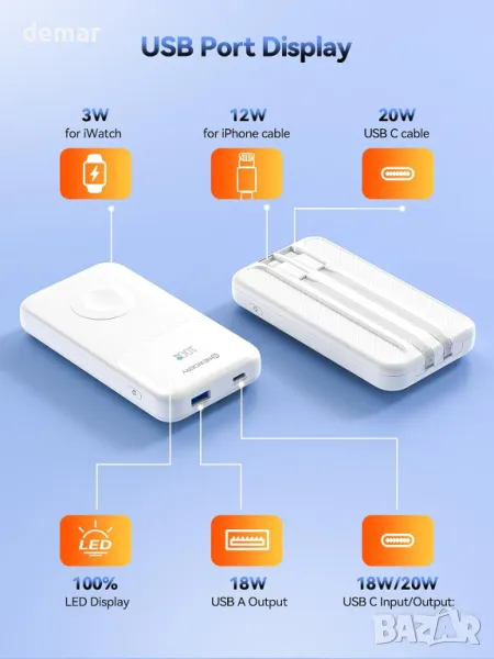 Компактна и удобна за пътуване захранваща банка с вградено зарядно за Apple Watch и интегрирани кабели за безпроблемно зареждане. Оборудван с батерия от 10 000 mAh, той поддържа PD 20 W бързо зареждане през USB-C, осигурявайки бързо захранване за iPhone и Apple Watch модели, включително Ultra, Series 9, 8 и по-стари. Проектиран за удобство, той елиминира нуждата от допълнителни кабели, което го прави идеален за пътуване и ежедневна употреба.