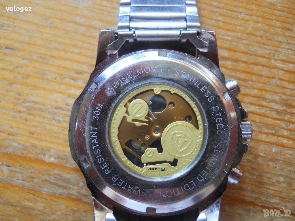 Мъжки кварцов часовник хронограф Shark - лимитирана серия Men's Sport Racing Speedy Style Tachymeter. Това е един от най-търсените модели на Shark. Характеризира се с швейцарски механизъм (Swiss Movt), устойчиво на надраскване, минерално стъкло и дизайн, включващ тахиметър и световно време.