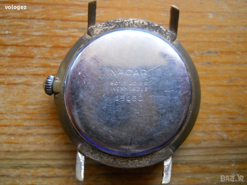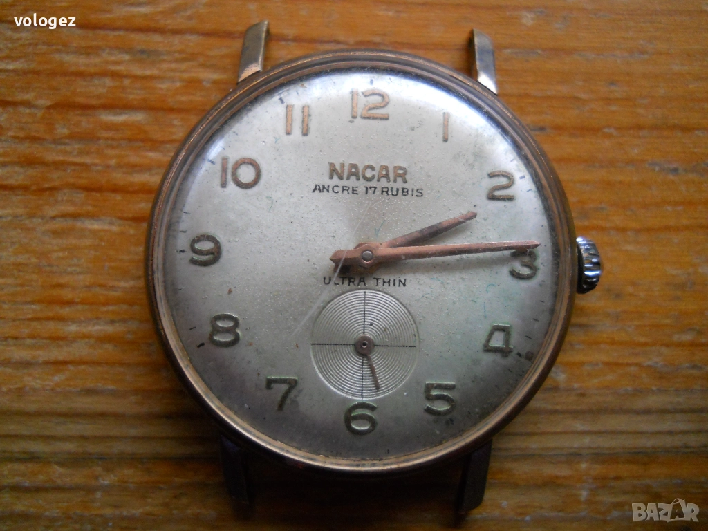 Винтидж мъжки механичен часовник Nacar Ultra Thin (Ултра тънък), с номер на модела 15450. Има маркировка "PLAQUE OR", която показва, че корпусът е със златно покритие. Надписът "Ancre" показва, че часовникът е оборудван с лостов механизъм (lever escapement), а "17 Rubis" - че механизмът съдържа 17 синтетични рубина, използвани като лагери за намаляване на триенето.