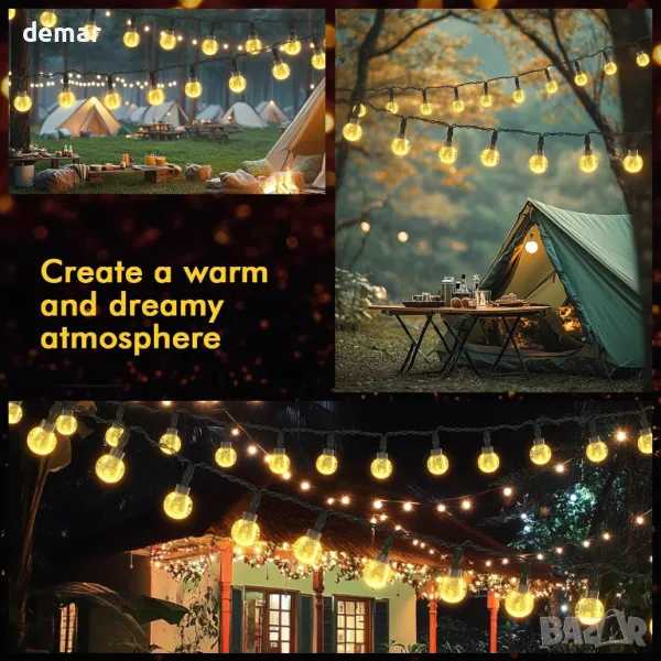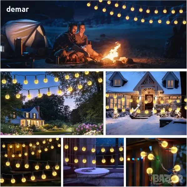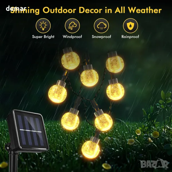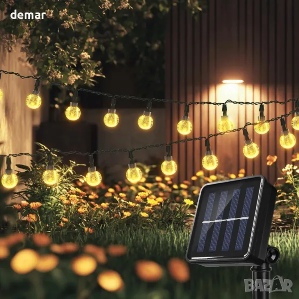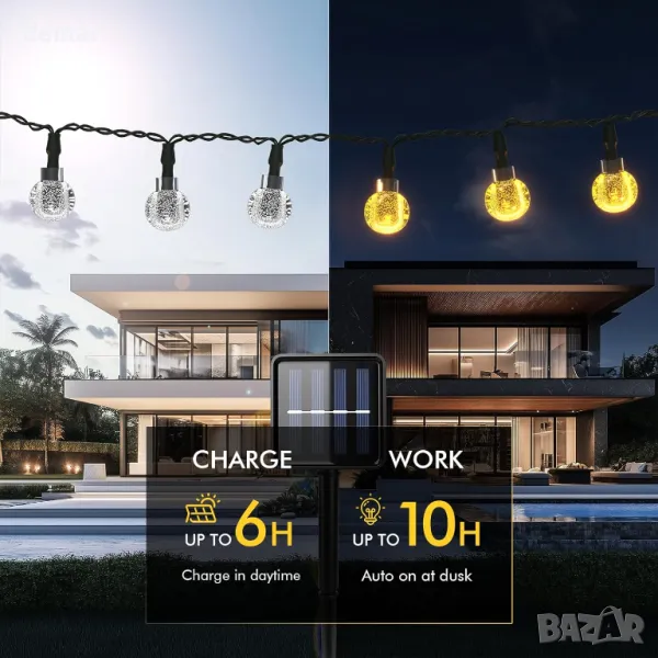 Захранвани със слънчева енергия 20 LED глобусни светлини с ефективен монокристален панел за преобразуване на енергия, елиминиращ смяната на батерията или допълнителните разходи за електроенергия. Сензорът за светлина позволява функция за автоматично включване/изключване при здрач и зазоряване. IPX4 водоустойчив дизайн издържа на всякакви метеорологични условия, което прави инсталирането лесно без необходимост от окабеляване. Разполага с 8 режима на осветление, управлявани чрез два превключвателя, позволяващи персонализиране за различни атмосфери. Вградената функция за памет запазва последната настройка на режима без ежедневно нулиране. Идеален за декориране на градини, вътрешни дворове, перголи, сватби и празнични поводи. Уверете се, че слънчевият панел е разположен на пряка слънчева светлина за оптимално зареждане. Моля, ВКЛЮЧЕТЕ външното соларно глобусно осветление преди зареждане и то ще се зареди автоматично.