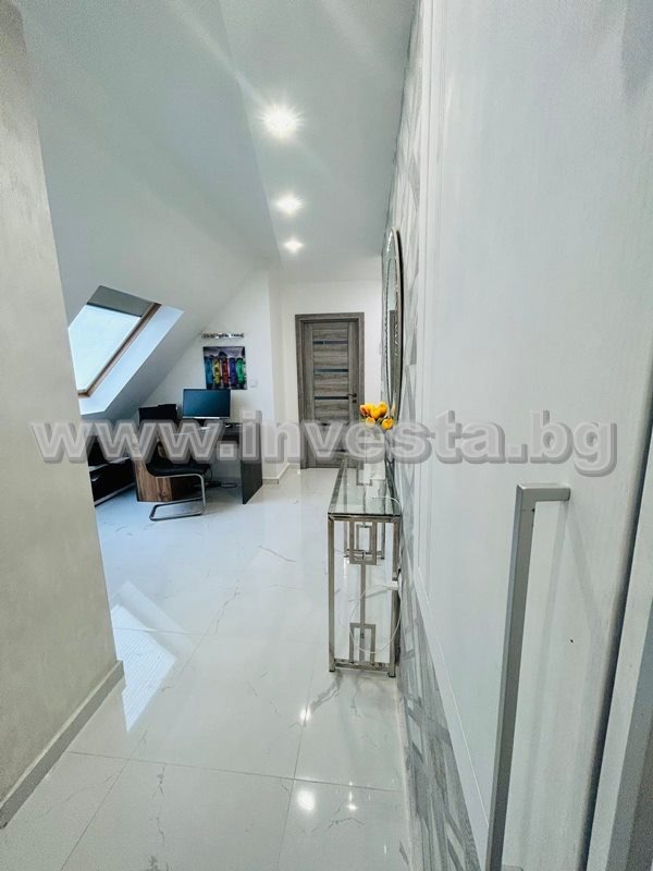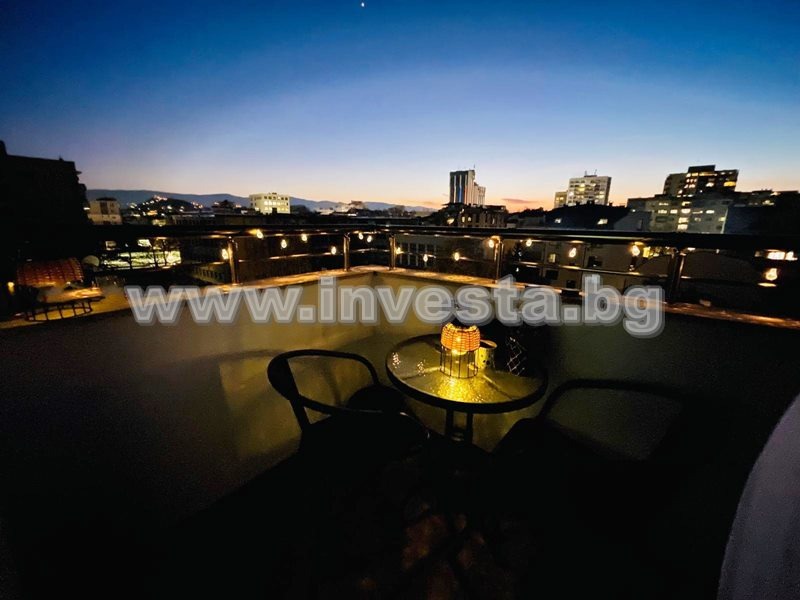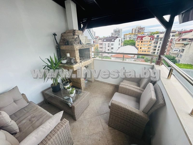 Оферта 42857. Апартаментът се намира в сграда, построена 2009 година, в близост до църквата Свети Иван Рилски. Сградата е малка, само с 11 апартамента, с асансьор. Жилището е самостоятелно на последния етаж, с чудесна панорама към града и всички изложения. Състои се от кухня с траперазия, тераса към кухнята с барбекю и градински мебели, преходен хол с площ от около 45 кв.м, коридор, две спални, едната от които е със собствен дрешник и тераса, голяма баня с тоалетна. Целият апартамент е с подово отопление и климатици. Продава напълно обзаведен и готов за живеене.