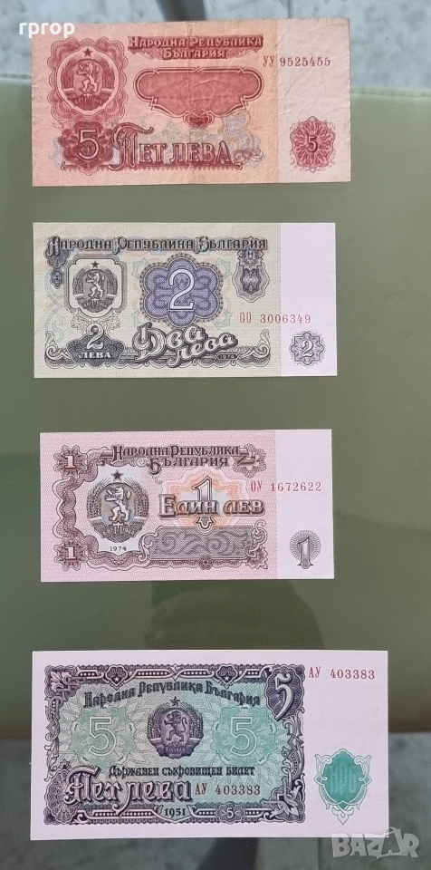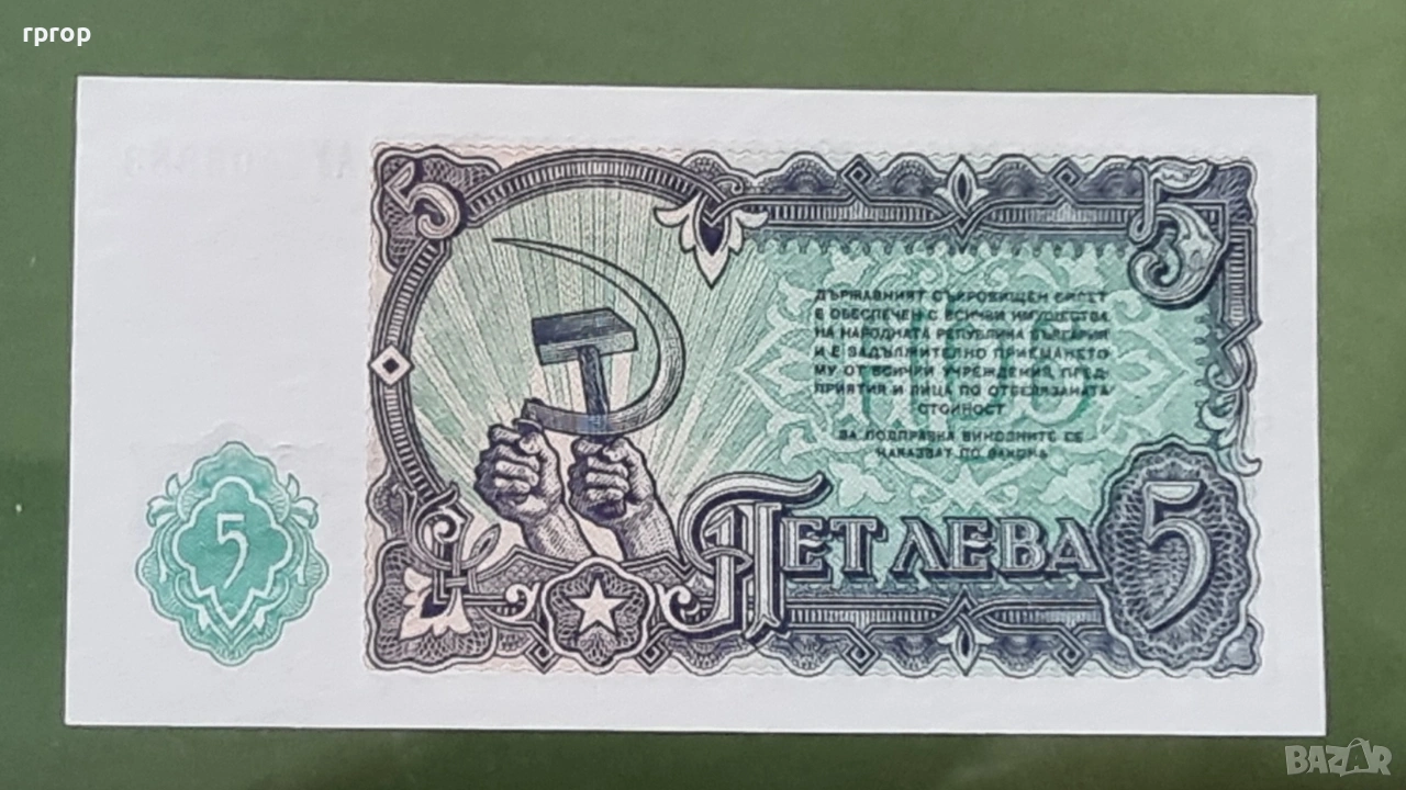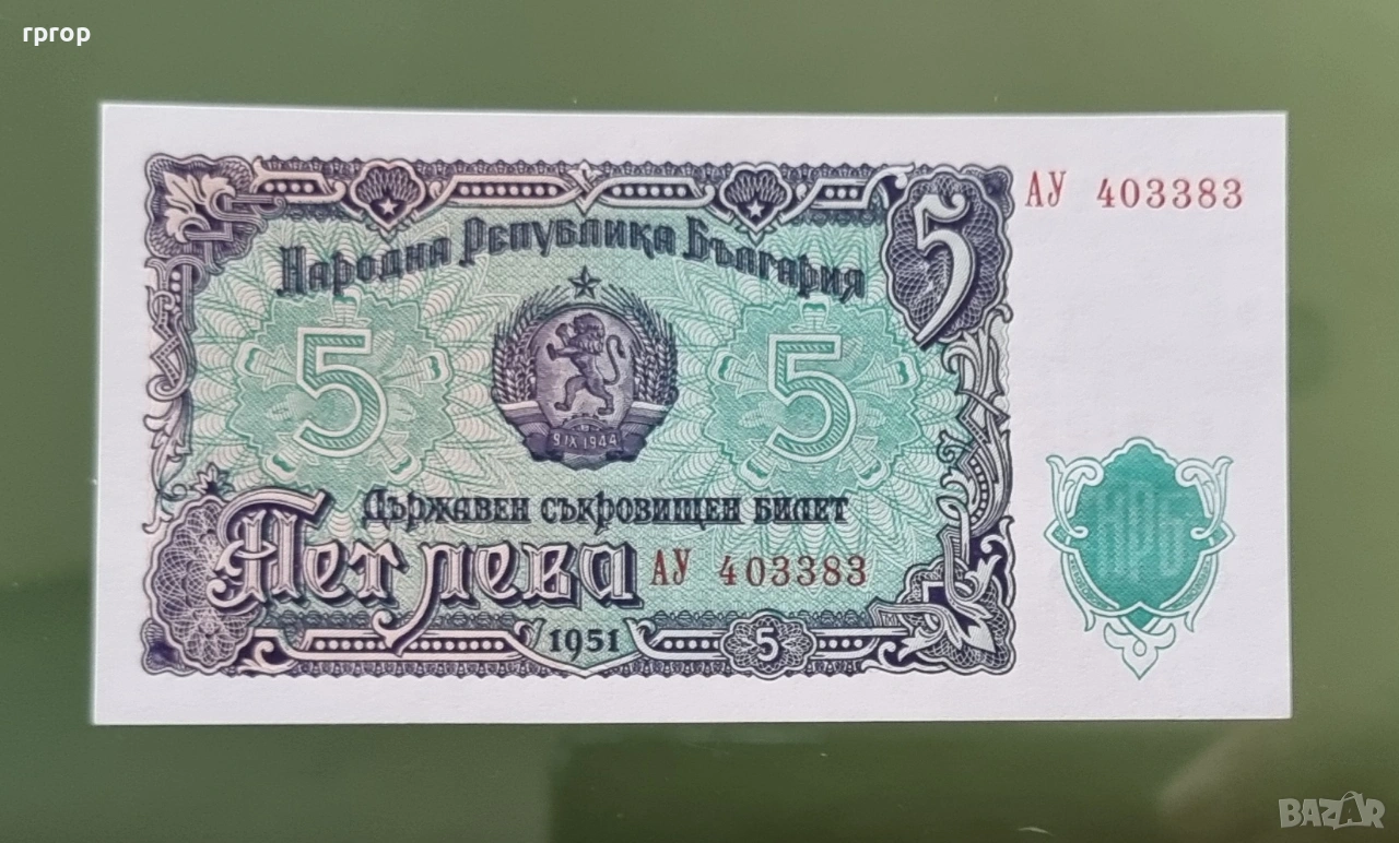 Банкнотата от 5 лева 1951 година е чисто нова.UNC.