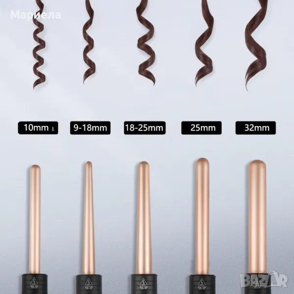 Комплектът шишове се състои от 5 различни размера шиша (9-18MM, 18-25MM, 19MM, 25MM, 32MM) , за да отговарят на различни нужди за оформяне. Дължината на машите е 16см. , което ги прави перфектният помощник за къдрене на дълга и къса коса .