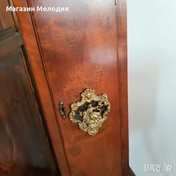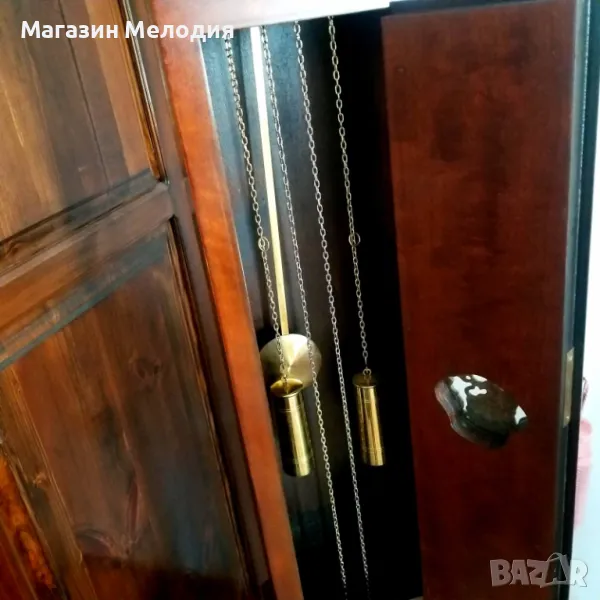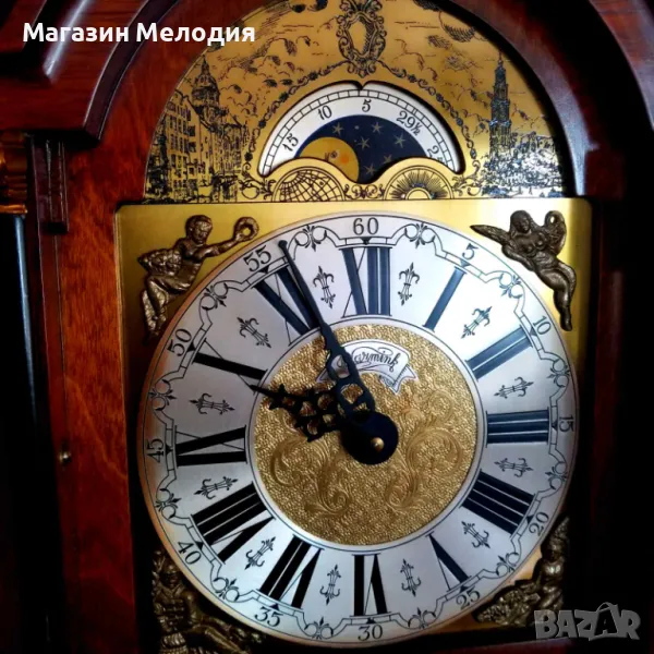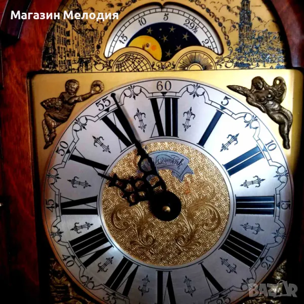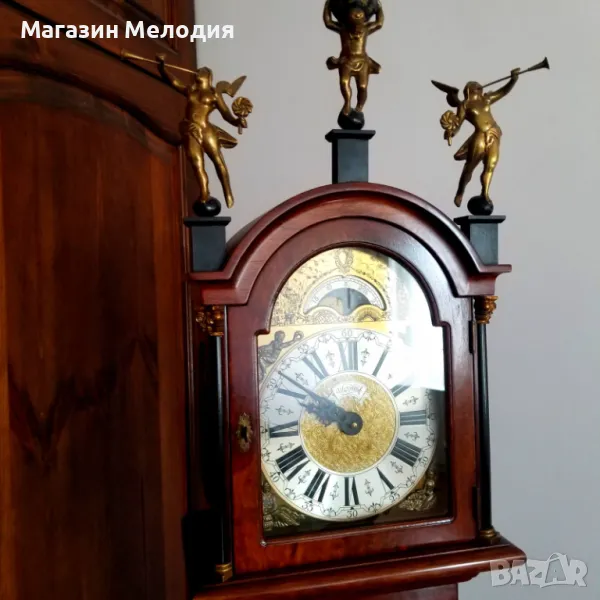 Само за колекционери. Страхотен паркетен холандски часовник. Уникално запазен, оригинален постамент, бронзови статуи на върха. Перфектна машина с топузи. Мек меден гонг на кръгъл и половин час. Показване на лунната фаза, махагон-корен. Абсолютно точен. Изключително рядък. Височина - 195см.