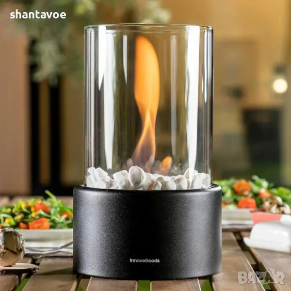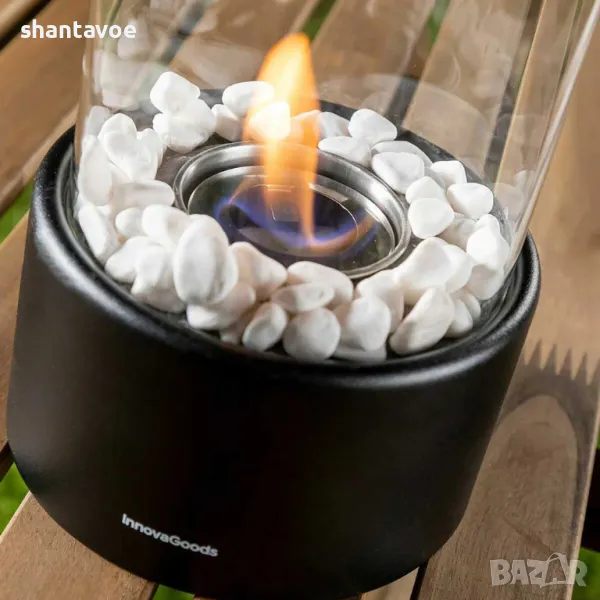 Камината е с метална черна основа, стъклен цилиндър и бели декоративни камъчета.