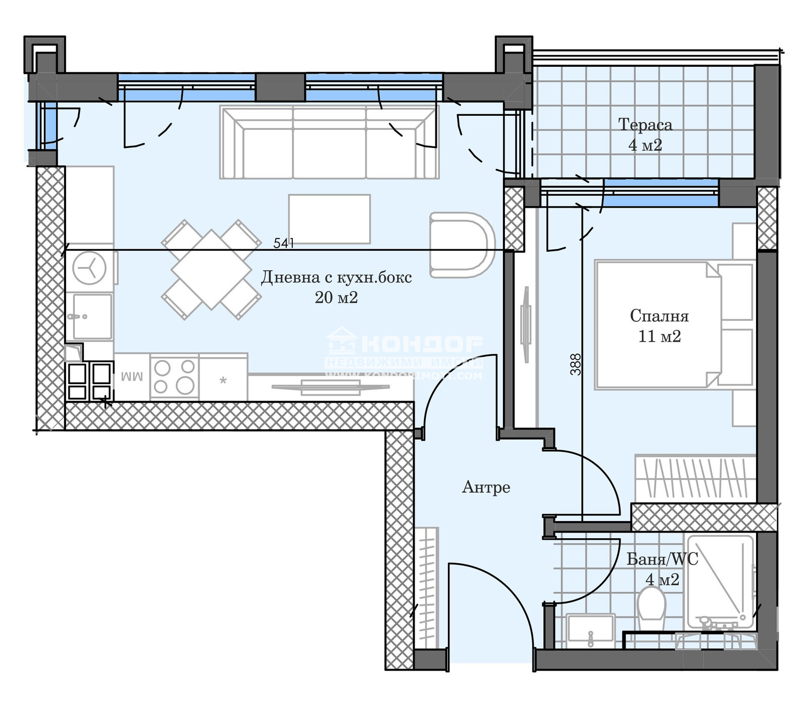 Оферта 66458: Предлагаме Ви възможността да закупите двустаен апартамент в новоизграждащ се луксозен жилищен комплекс с модерна визия, проектиран да създаде максимален комфорт на живущите в него. Tри хоризонтално разположени жилищни секции с елегантен силует готов да предложи комфорт и модерен начин на живот. Едно от основните му предимства е добрата локация, отлична комуникативност и динамична пътна инфраструктура, която осигурява бърз и лесен достъп до комплекса, от всяка точка на града. Той съчетава лукс, спокойствие и комфорт, с подсигурени паркоместа и гаражи. Жилището се състои от дневна с кухненска част и трапезария, една самостоятелна спалня, баня с тоалетна, входно антре и една обща тераса. Към апартамента има избено помещение включено в цената на апартамента. Основната концепция при проектирането е да се постигнат просторни и функционални стаи, с цел да се създаде максимален уют на модерното семейство. Изключителна съвременна архитектура и модерна технология на строителство. Визията е иновативна, привличаща внимание с уникалността си. Всяко жилище ще разполага с пълно окабеляване за домофон, интернет и кабелна телевизия, общите части са луксозно завършени, жилищата са с алуминиева дограма с троен стъклопакет от най-висок клас, масивна блиндирана входна врата. За удобство на живущите съществува възможността да закупят подземни паркоместа и гаражи с топла връзка към комплекса. Гъвкави схеми на разсрочено плащане спрямо възможностите на клиента в рамките на строителството или закупуване чрез Банков Кредит, на изключително изгодни условия за клиенти на агенцията!!! Приложените изображения са от завършени проекти на строителната фирма.ВИЖТЕ ОЩЕ ИЗГОДНИ ОФЕРТИ НА https://www.kondorimoti.com/ С ЕЖЕДНЕВНА АКТУАЛИЗАЦИЯ!