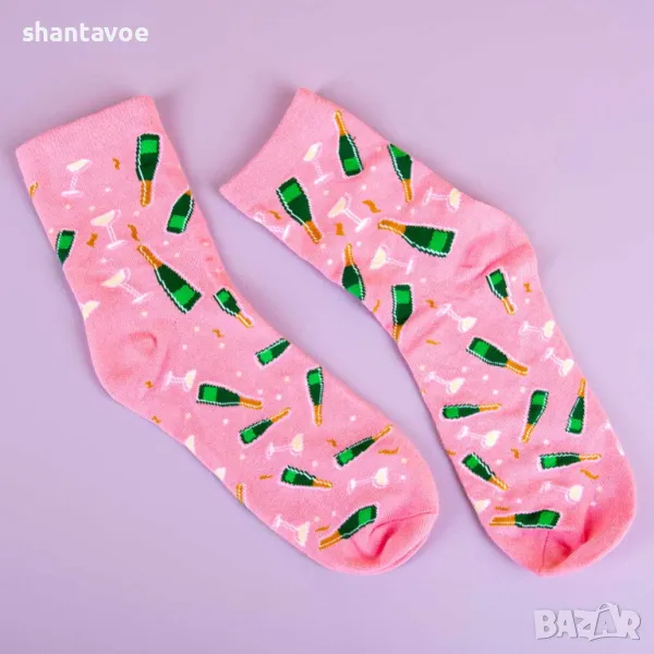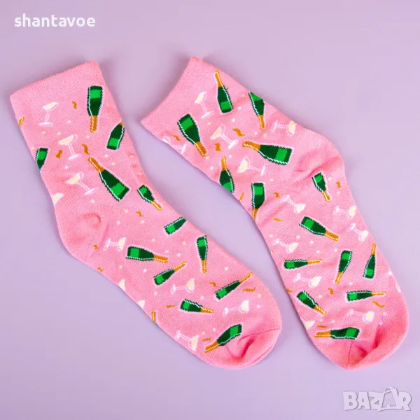 Самите чорапи имат светло розов цвят, форми на зелени винени бутилки и пълни чаши.