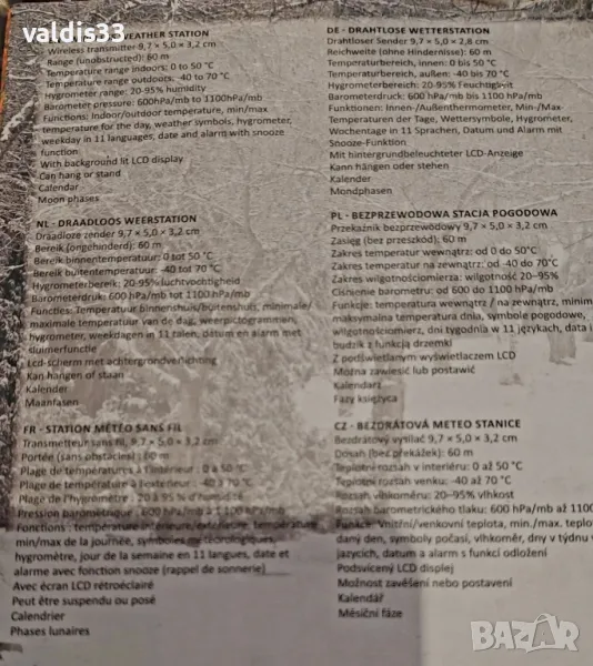 Подробности за продукта:Цвят: черенМатериал: пластмаса, стъклоРазмери: 17 x 13 x 3 cm (В x Ш x Д)Тегло: 500 грLCD екранРадиоуправляем часовник, дата на будилника (часът може да се показва в 12 или 24 часов формат)Датата може да се показва на 11 езика; Английски, немски, италиански, френски, испански, холандски, датски, полски, чешки, словашки и рускиТемпературата може да се показва в °C или °FВътрешна температура: 0 до 50°CВъншна температура: -40 до + 70 °C, с предупреждение за замръзванеДневна висока/ниска температураХигрометър показва дневни нива на влажност на открито и закрито: 20 – 95%Барометър: 600-1100 hPa с памет за последните 12 часаПрогноза за времето въз основа на атмосферното наляганеФази на лунатаДисплей с осветлениеЧестота на предаване: 433.92 MHzРаботно разстояние: 60 m (без никакви препятствия)Захранване с батерии: 2 x AA 1.5V (не са включени)Сензор захранван с батерии: 2 x AA 1.5 V (не са включени)Захранване: DC 5V 600 mAМоже да бъде окачен или стоящ