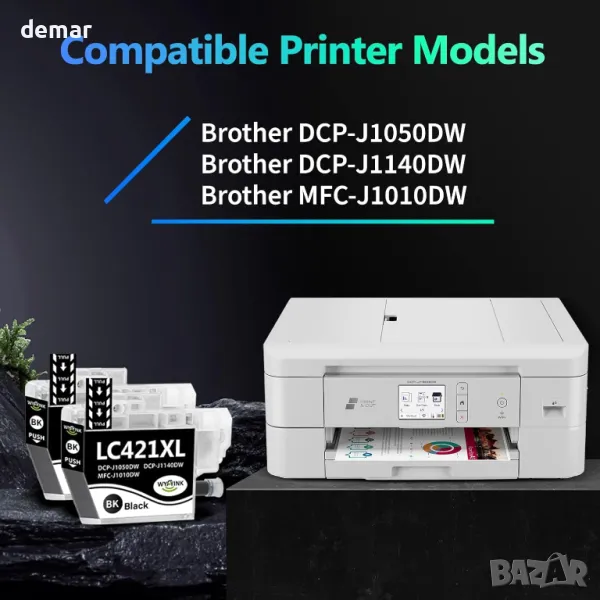 Съвместими с принтери Brother DCP-J1050DW, DCP-J1140DW и MFC-J1010DW, тези резервни касети с мастило LC421XL осигуряват резки, живи и дълготрайни разпечатки. Пакетът включва три черни касети, всяка от които дава приблизително 500 страници при 5% покритие A4. Разработено от специален технически екип за подобрено качество и производителност. Опаковката може да варира.
