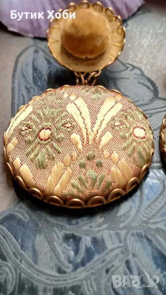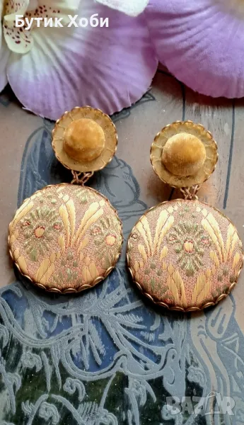 Оригинални дизайнерски обеци от Mirca ti, италиански бранд .Ръчно изработени, комбинация от бижутерска сплав и текстил със старинно ,,звучене,, В добро състояние са. Налични маркировки. Дължина - 6,5см, диаметър - 2,5/4см.