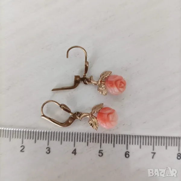 Нежни антикварни немски златни обеци-8к,проба 333 с естествен розовобял корал,изрязан във формата на роза.Цена 450 лв.Има леко потъмнявате на златото, трябва да се полират.