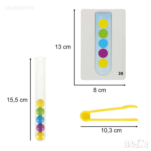 Топчетата се поставят в колбичката с помощта на пинсета, за да се упражнява фината моторика на децата.