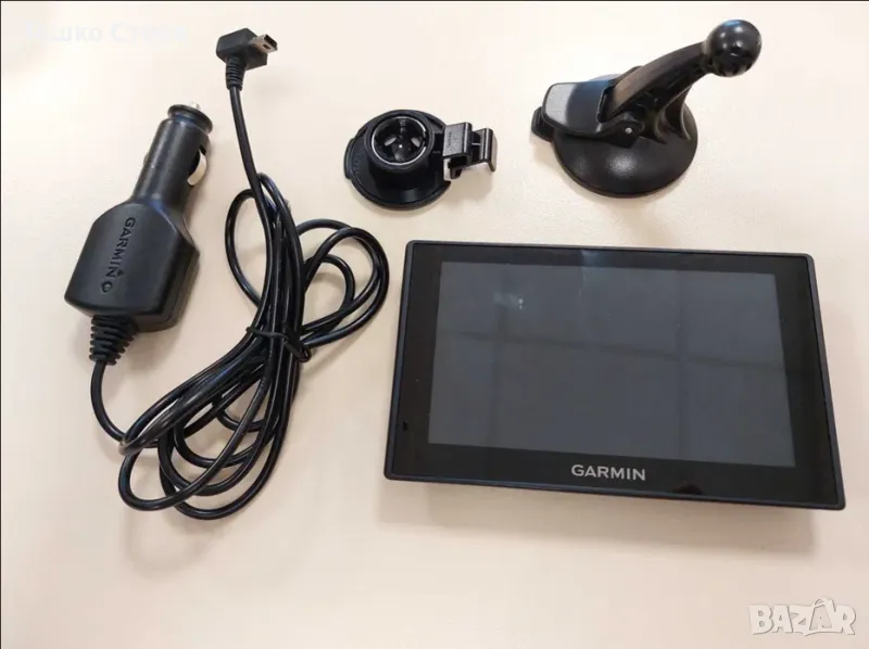 GPS навигация Garmin DriveSmart 50LM, зарядно за кола, стойка с вакуумче за стъкло и кутия за съхранение.