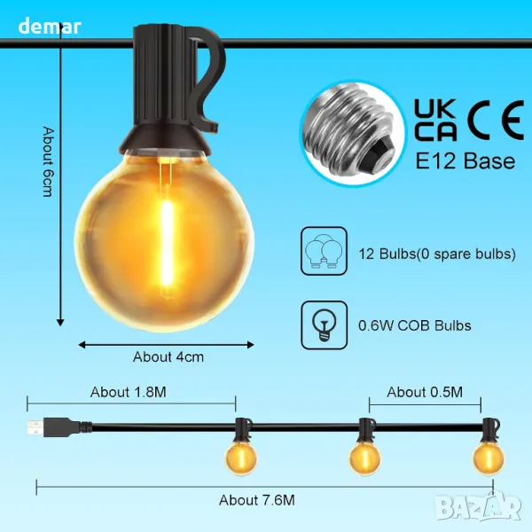 IKERY USB градински струнни лампи, 7.6M топло бяло 12 COB глобусни крушки IP65
