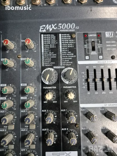 С 12 канала и 500 вата на страна или 1000 вата мостови, 12-канален миксер Yamaha EMX5000-12 с мощност 1000 вата ще се справи с по-големи концерти и групи. Канали 1-8 осигуряват XLR и TRS телефонна връзка. Канали 9/10 и 11/12 имат телефонни и RCA жакове. Вмъквания на канали са осигурени на всичките 8 моно канала. 3-лентов EQ на всички канали, плюс 9-лентова графика. Двойните SPX цифрови 24-битови ефекти осигуряват 2 блока от 16 предварително зададени настройки. 4 aux изпращания включват 2 пре/след и 2 за ефекти. 2 - 13-точкови метри. Други функции включват превключвател за избор на мощност, нискочестотен филтър на моно изход, превключвател за режим на готовност, конектор за лампа и връзка с крачен превключвател за включване/изключване на Effect 2 и докосване.