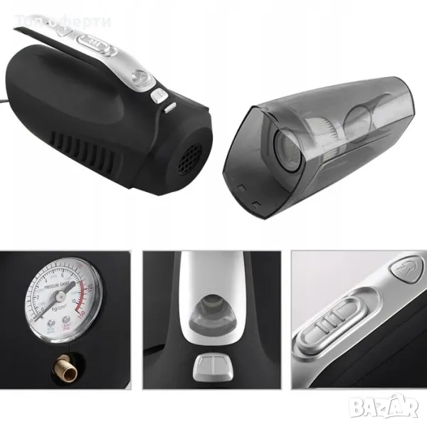4 функции: прахосмукачка, фенерче, компресор, манометър за гуми.