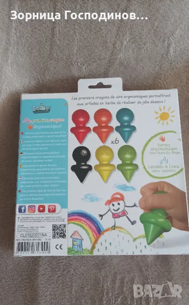 Продавам нов творчески комплект на френската фирма Créa Lign: моята първа кутия с моливи. Тези восъчни пастели ще позволят на начинаещите художници да създават красиви рисунки. Тъй като са ергономични, те осигуряват отлично захващане на малките. Без притеснения за родителите, цветовете останали по ръцете или дрехите се перат с вода!